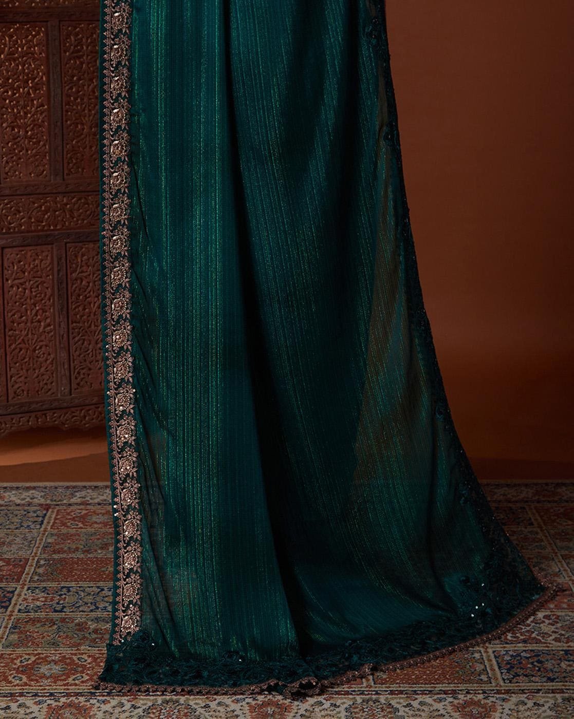 - This is coordinated with unstitched blouse piece is adorned with congruent sequined floral motifs, offering a complete and polished ensemble suitable for any occasions.